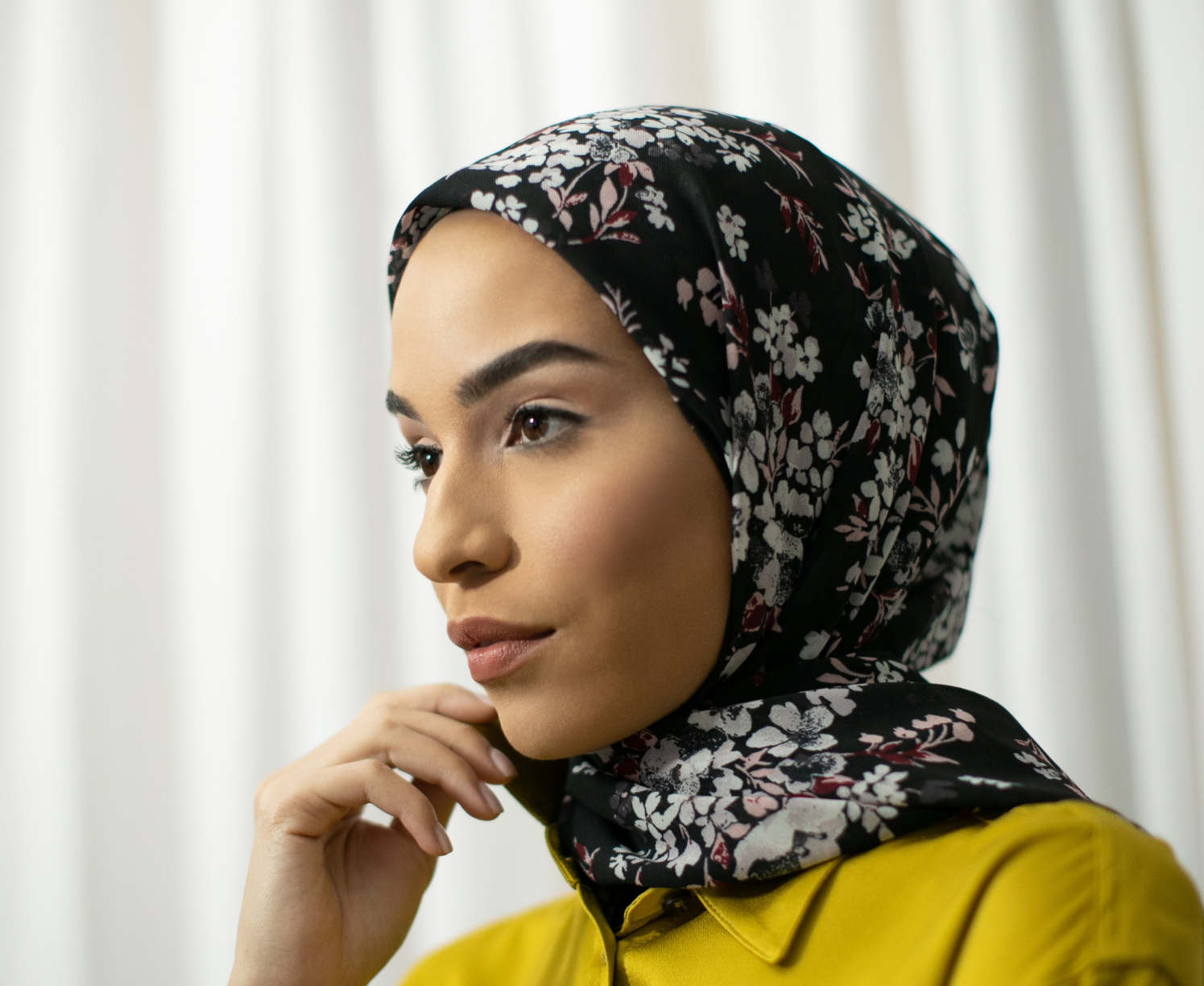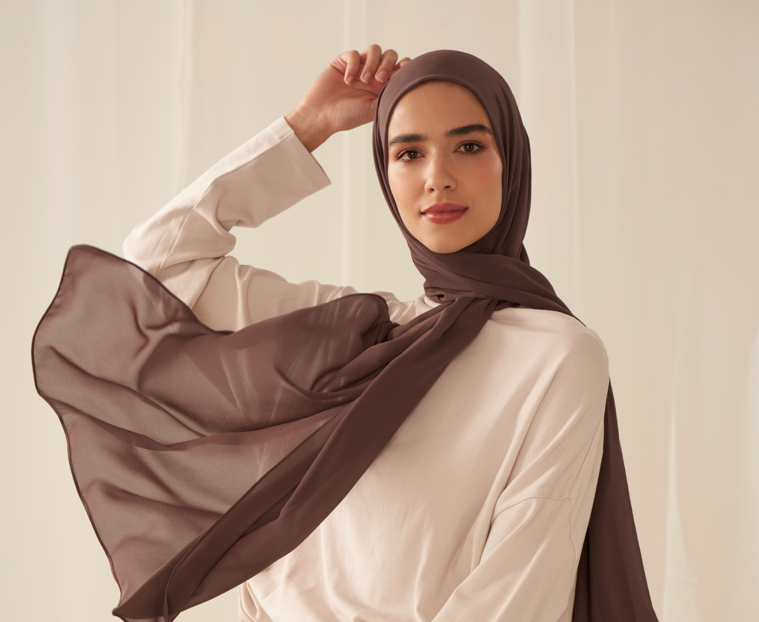 Chiffon is a light, airy, non-stretch fabric that's versatile enough for casual, professional or formal wear. It has a translucent weave that becomes opaque when folded over. Because of its lightness, it's an especially great option for when you want a sleeker, less bulky style or need a hijab that you can tuck into a turtleneck or high-collared shirt. Because it's a smooth fabric without stretch, you may prefer to wear it with an underscarf and/or magnetic pins to secure looser or draped styles. That said, certain styles — like CEO Melanie's favorite way to wear it — do just fine without an underscarf too.