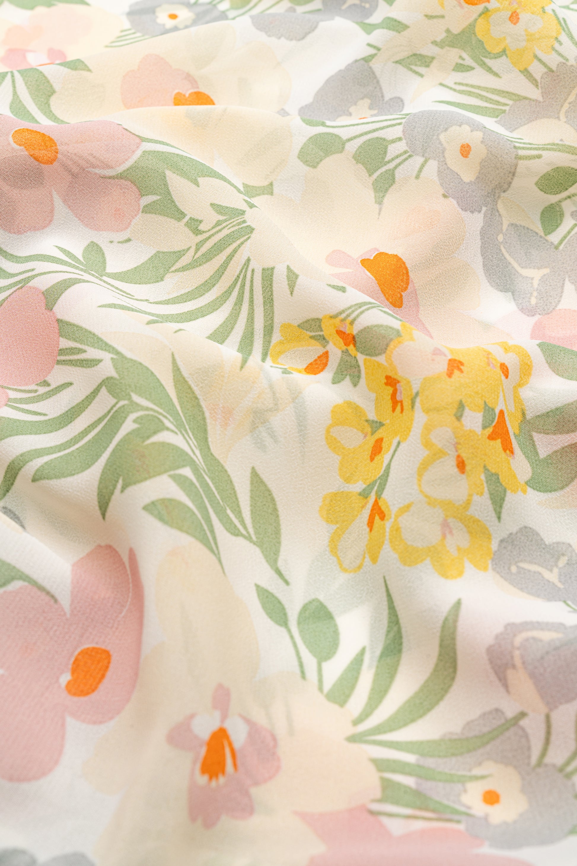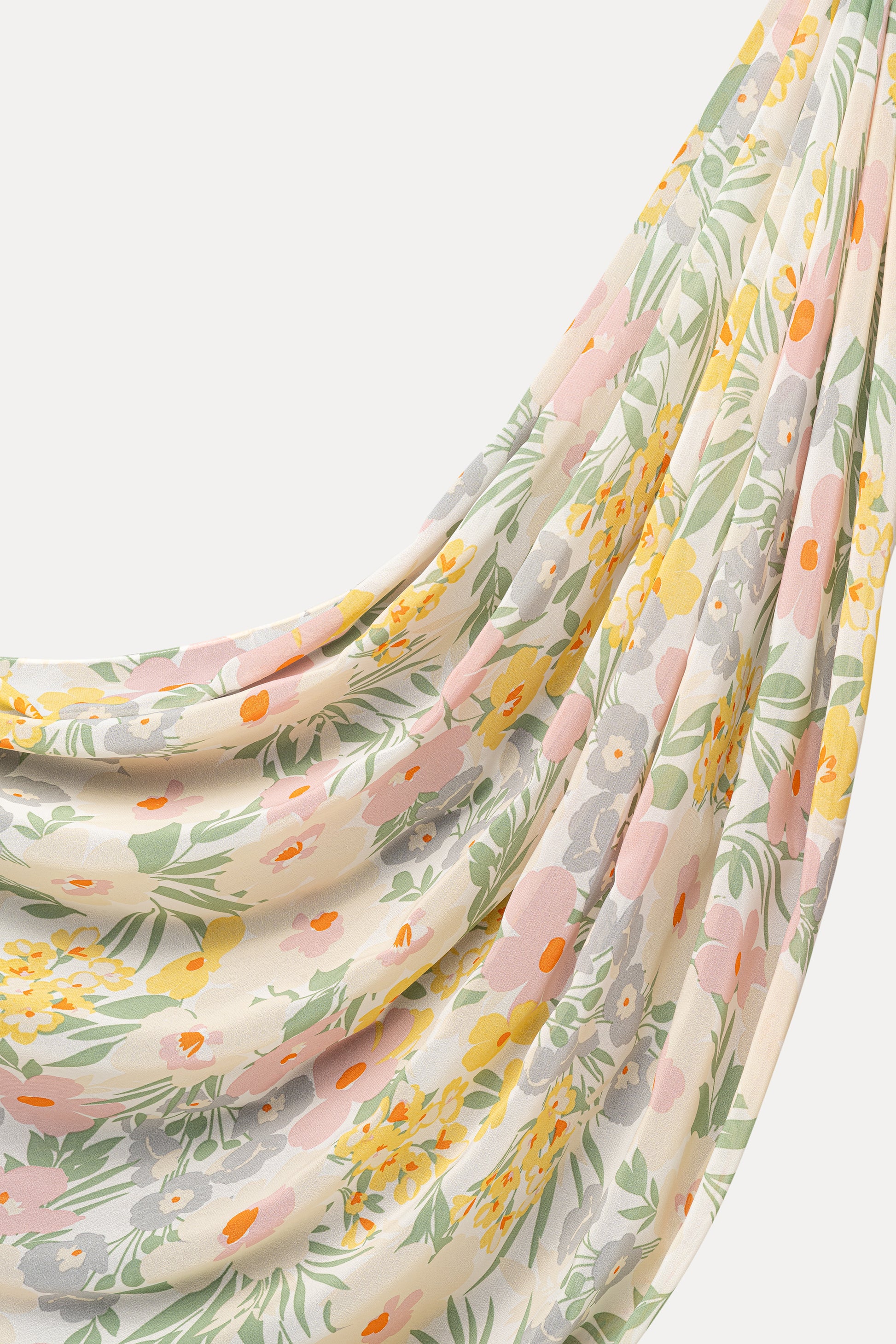 You'll feel like spring royalty in the Botanic Queen Hijab, featuring a serene burst of florals in soft pastels across the white canvas of our fairly textured, slightly thicker chiffon. It pairs beautifully with a sage green top or a flowy maxi dress.