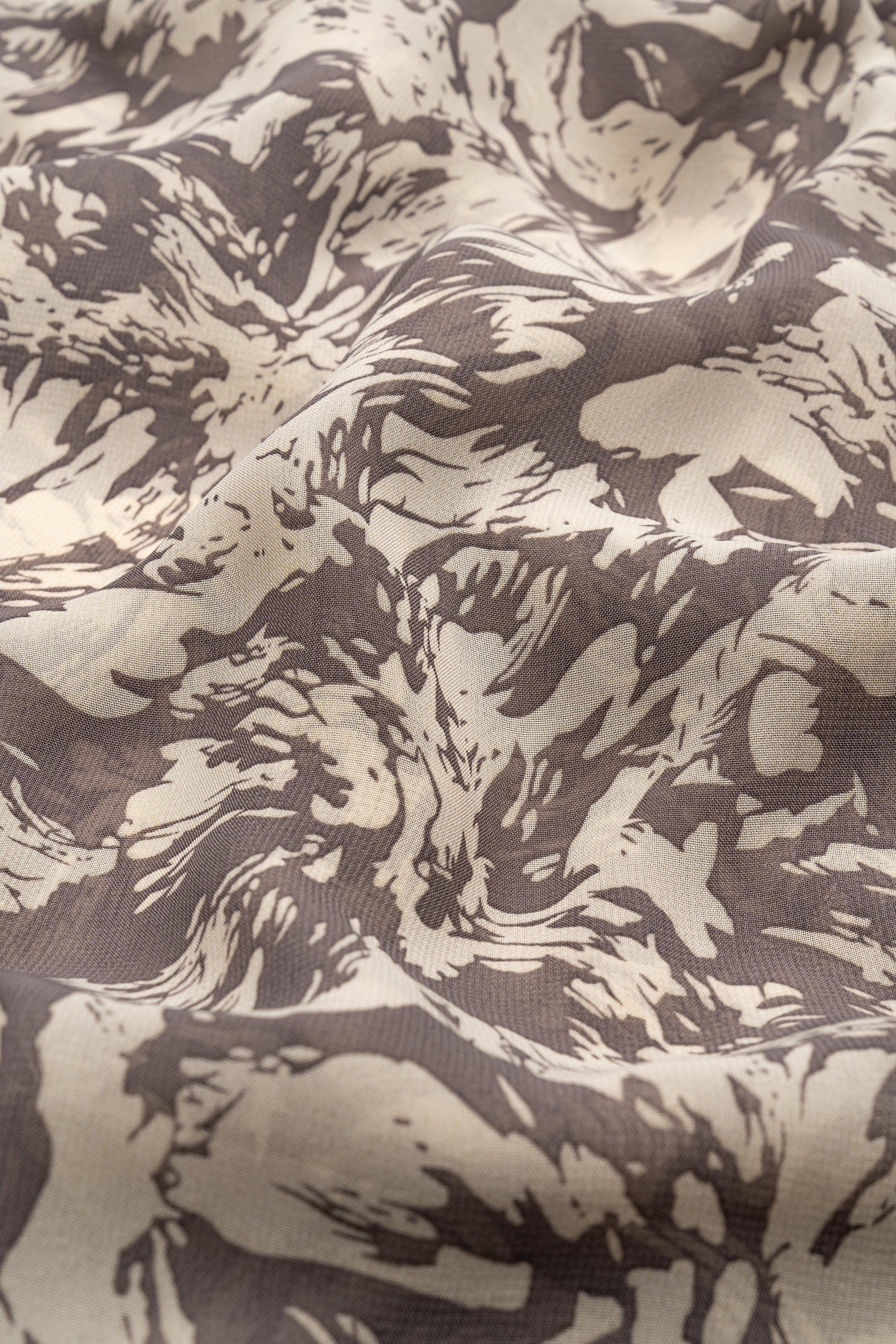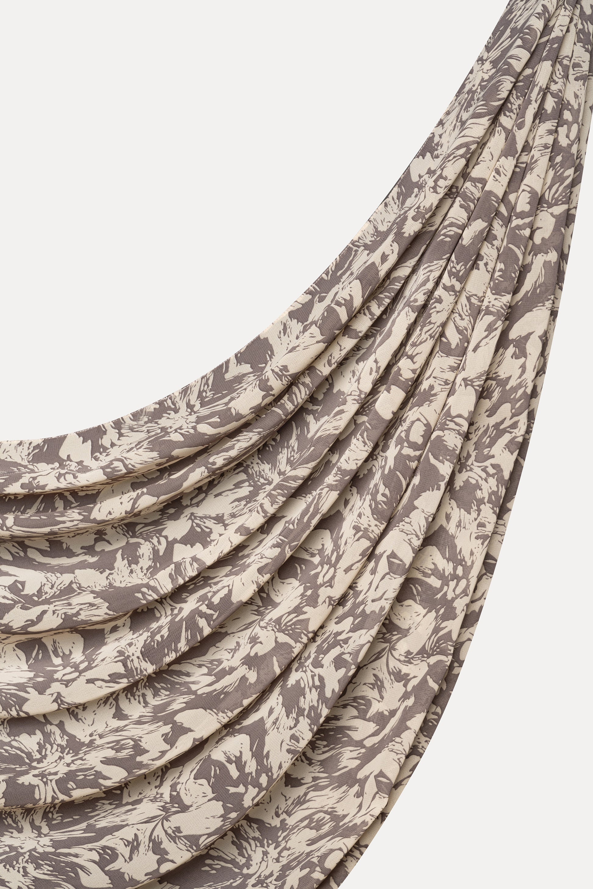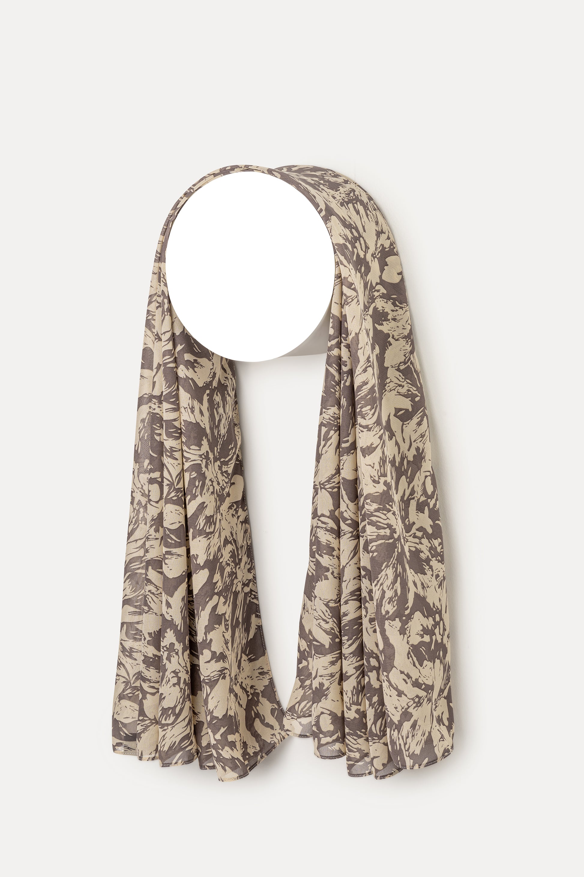 The Moonlight Magic Hijab features a lovely gray and cream abstract print on our signature chiffon. We love it with a cream-colored blouse and wide-leg trousers for an effortless look.