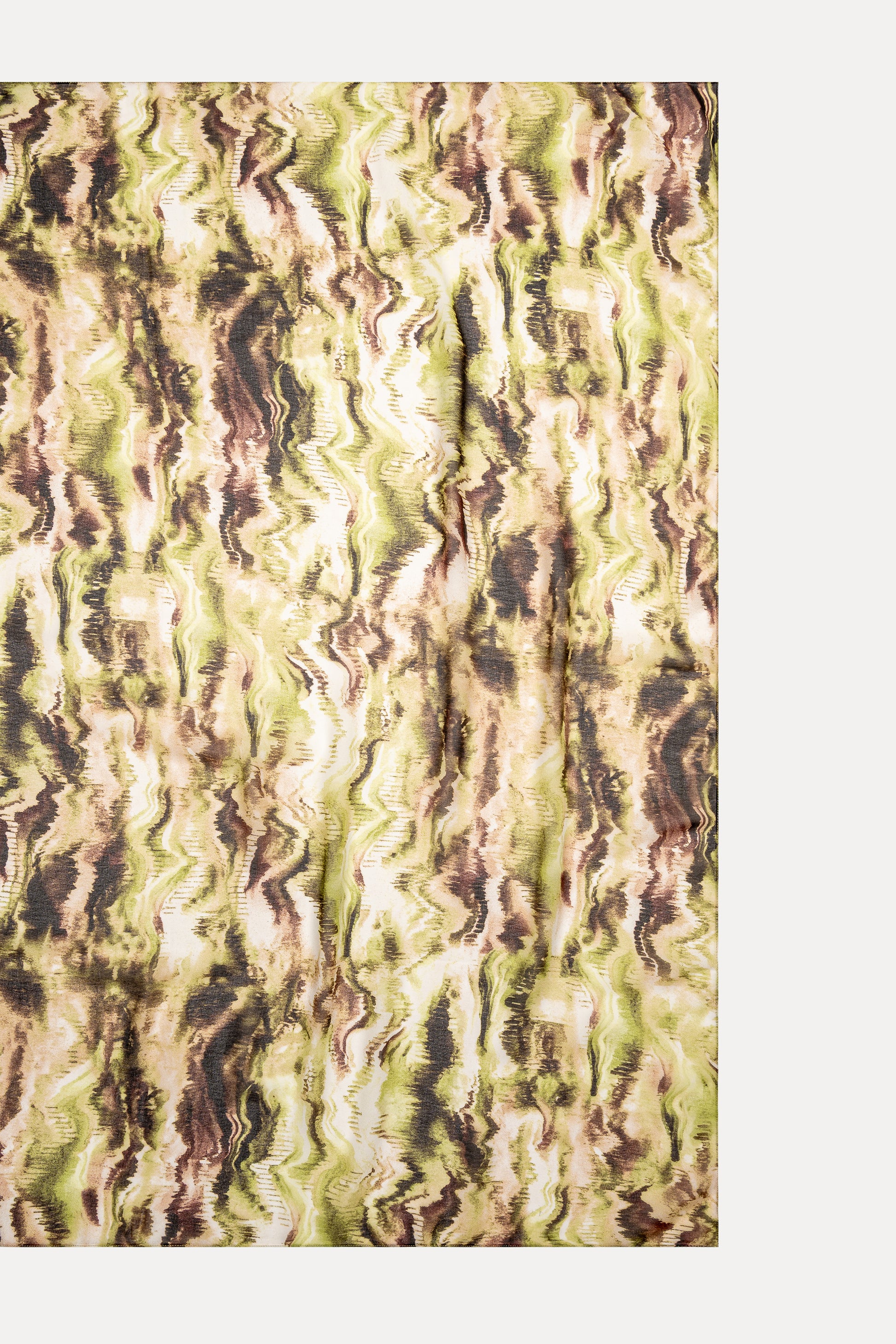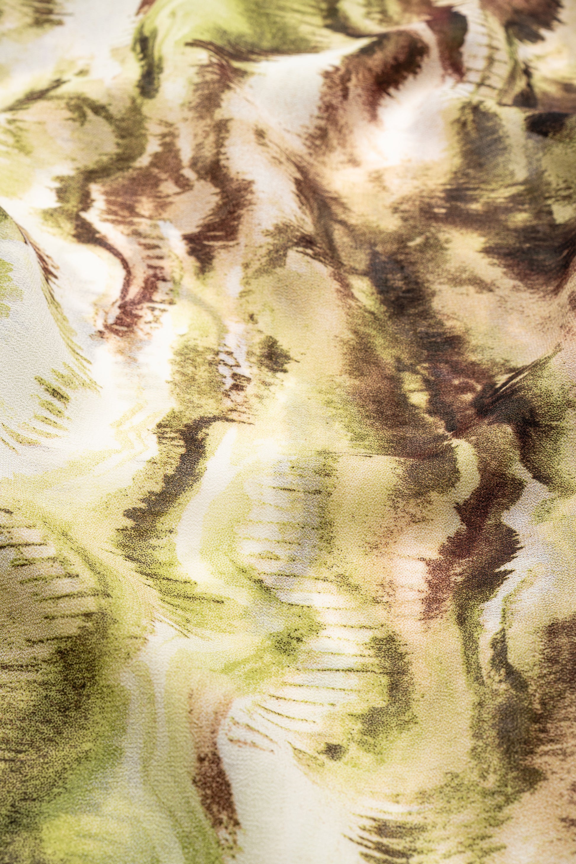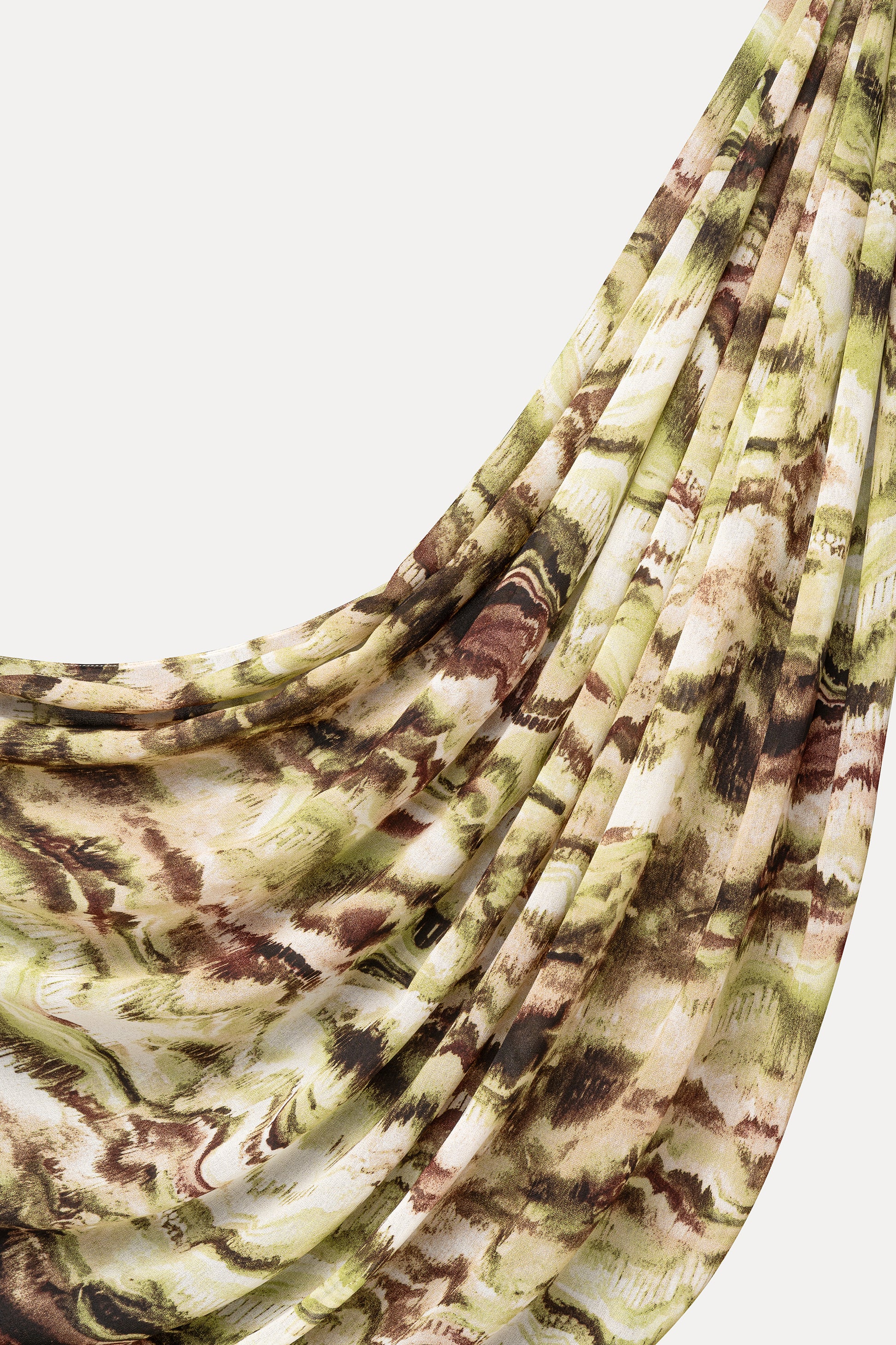 The Olive Harvest Hijab features earthy green and brown tones that beautifully come together on our textured, slightly thicker white chiffon. We love the rich, natural tones for a transitional and versatile look that can shift between seasons and styles.