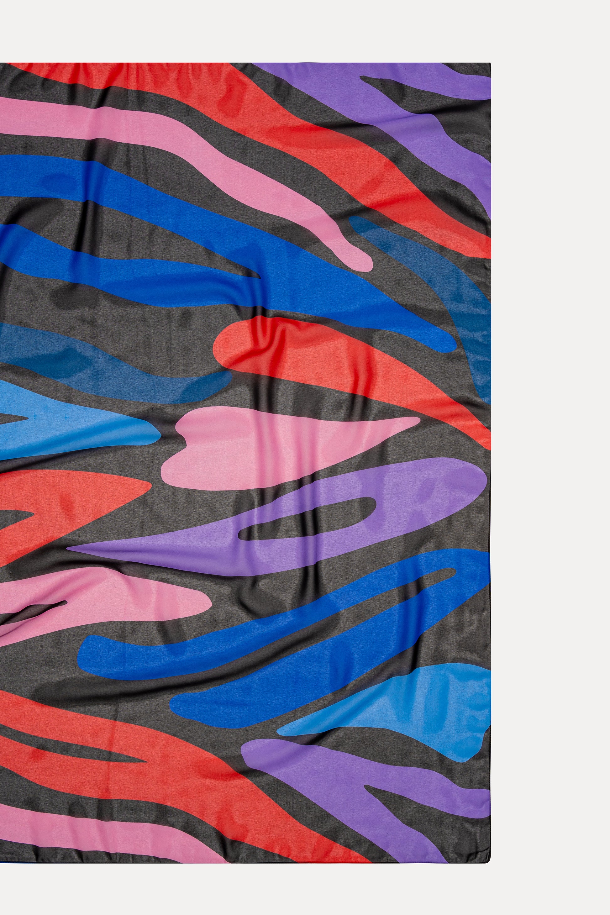 The Retro Swirl Hijab features a fun, mod print in rich colors that pop against the deep black hue of our signature chiffon. We love it with black, wide-leg linen pants and a red top for effortless style.