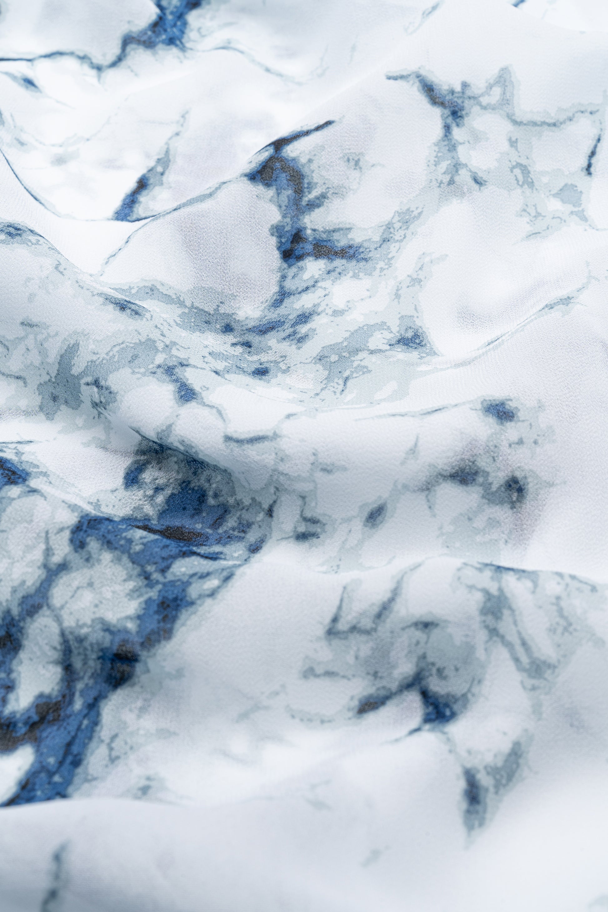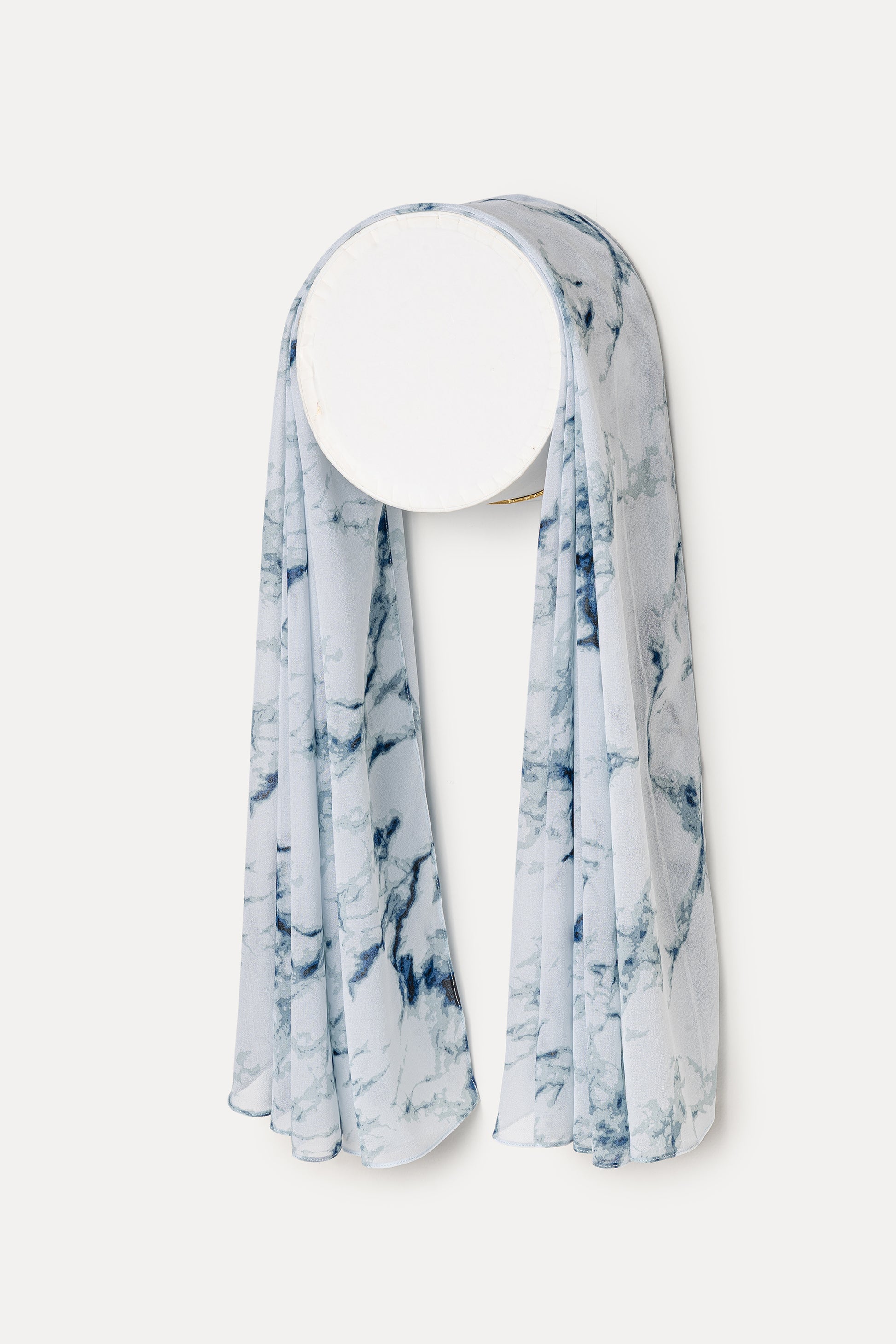 The Thassos Thread Hijab features understated beauty in a cool grey marble print and blue and black accents on the crisp white background of our fairly textured chiffon. You can't go wrong with such a versatile piece, so snag it and add it to your rotation.