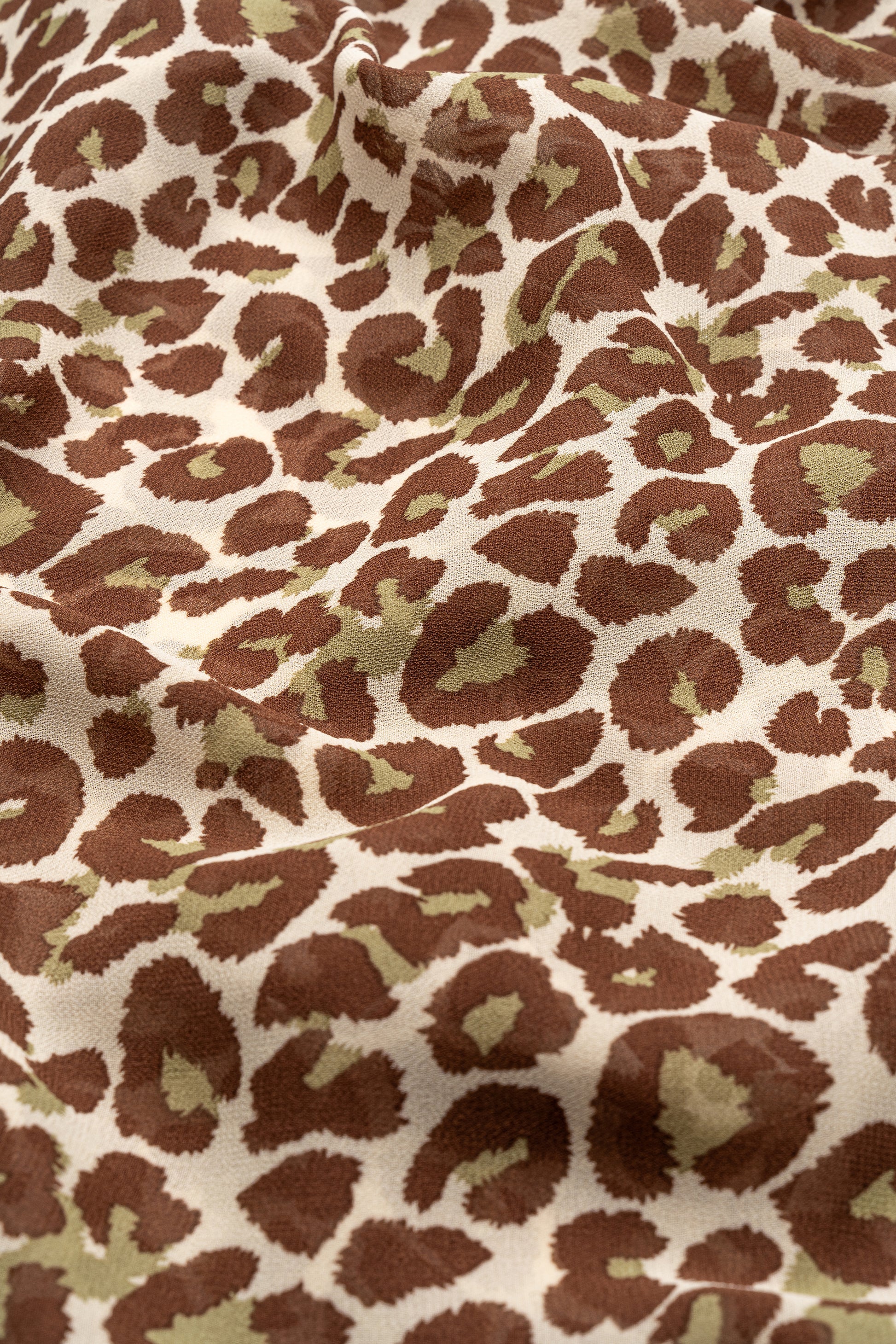 The Velvet Leopard Hijab features a classic print with beautiful brown and olive green rosettes on the soft beige background of our fairly textured chiffon. We love it with a green sweater and black denim for a chic look.