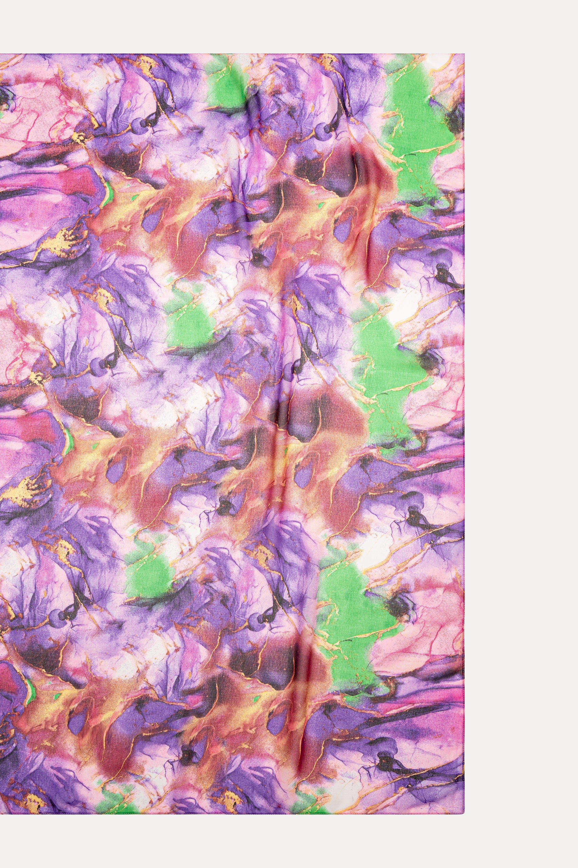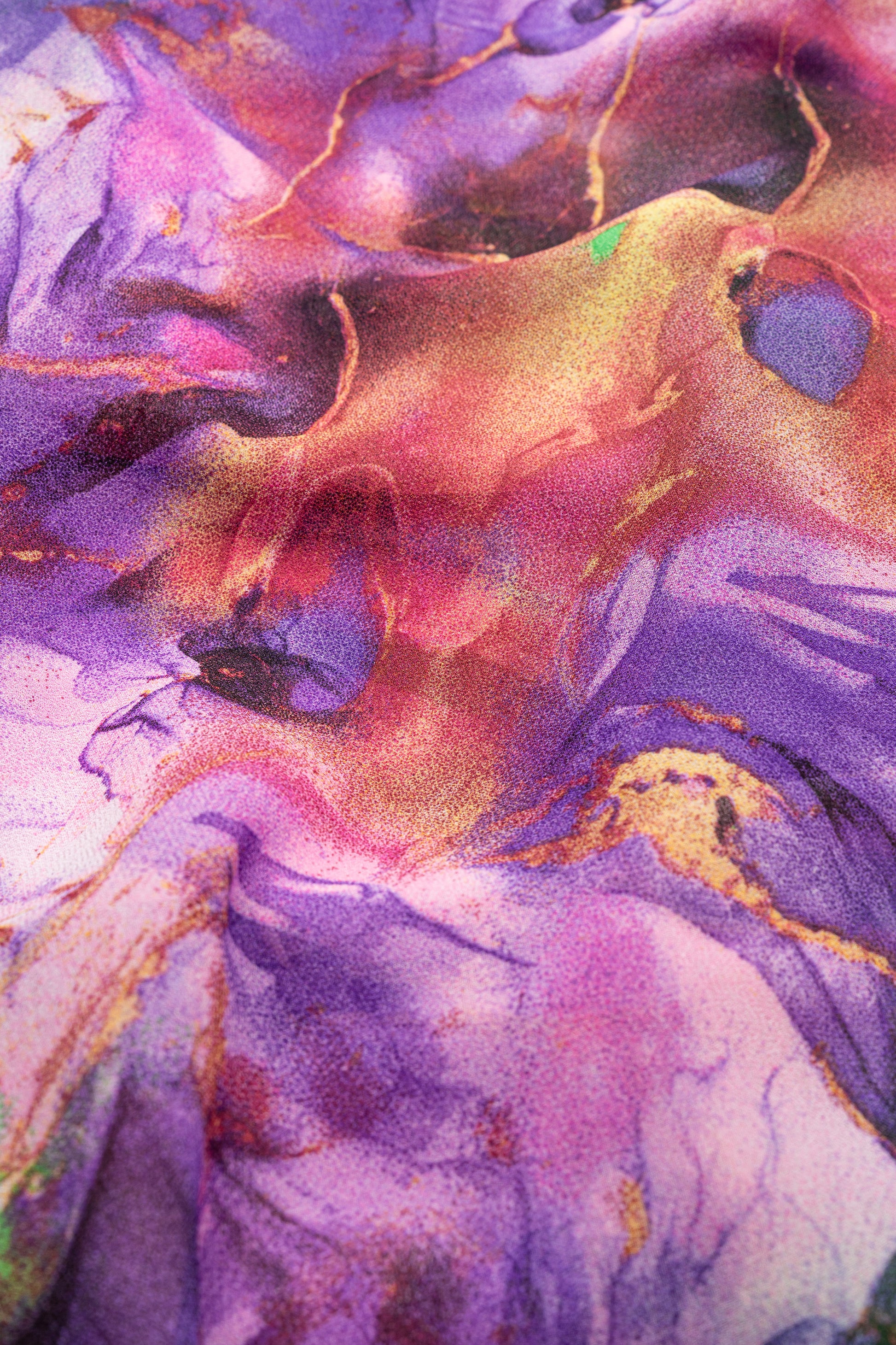 The Velvet Royale features a beautiful abstract print with an artistic blend of royal purple, burgundy, flamingo pink, bright green, and amber accents on our textured chiffon. Pair it with a deep purple top and cream trousers for a rich and luxurious look.